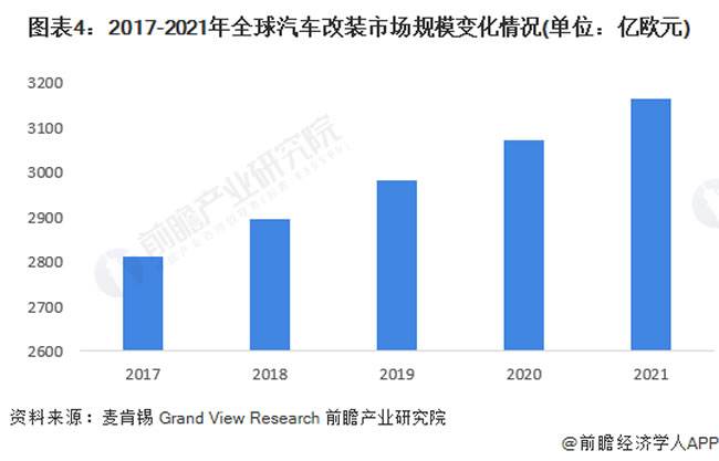 以上仅仅简单进行分类,实际上在汽车改装的具体项目上,据网络数据了解,2019年全球汽车改装市场规模已经超过2900亿欧元,在2030年将接近4186亿欧元。2017-2021年,全球汽车改装市场规模逐年上升,2021年全球汽车改装市场规模超过3000亿欧元。汽车改装作为汽车后市场的重要组成之一,在北美、欧洲、日本等汽车工业发达国家和地区获得了快速发展,汽车厂家每生产出一辆新车,其配套的改装配件及技术便应运而生。